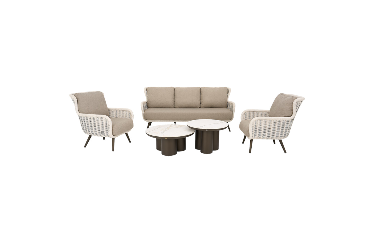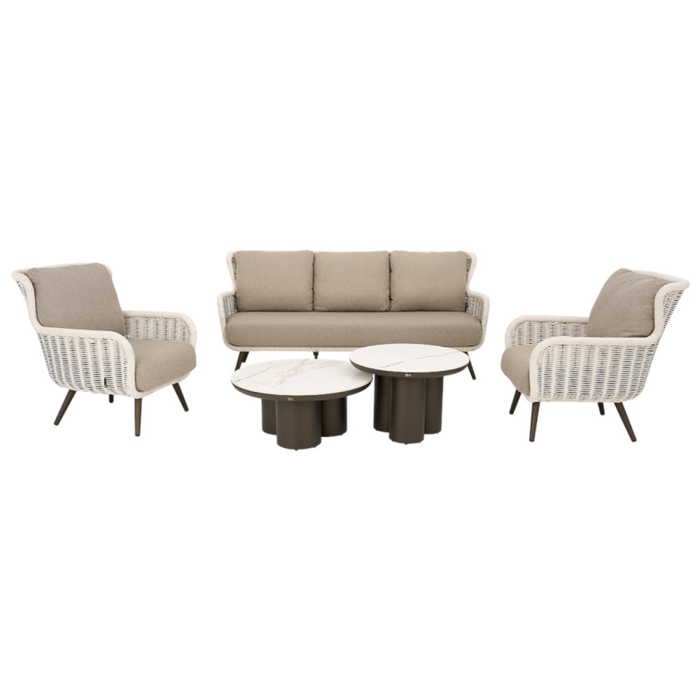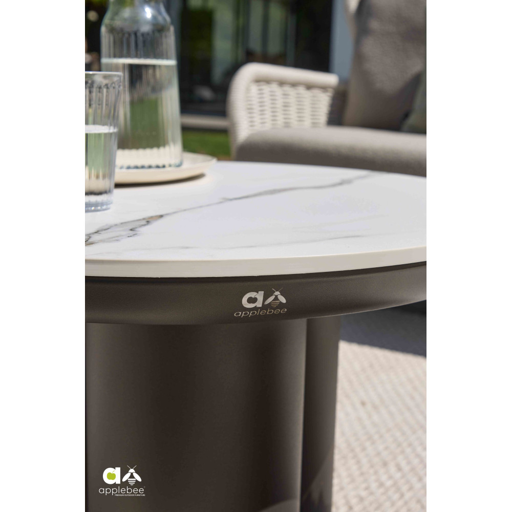 Key Largo od Apple Bee to połączenie ciepłego odcienia Bronze, jasnej plecionki Biculair® Twisted Ivory oraz eleganckich blatów z sintered stone marble — tworzące trwałą i stylową strefę lounge w nowoczesnej przestrzeni outdoor.