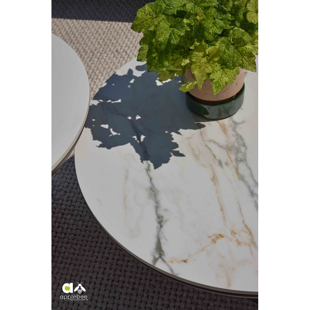 Stoliki kawowe wyposażone są w blaty z sintered stone marble — nowoczesnego spieku kamiennego z efektem marmuru. Materiał cechuje się wysoką odpornością na zarysowania, wilgoć, zmiany temperatury oraz promieniowanie UV. Powierzchnia jest łatwa w utrzymaniu i odporna na gorące naczynia, co czyni ją idealnym rozwiązaniem do intensywnego użytkowania outdoor.
