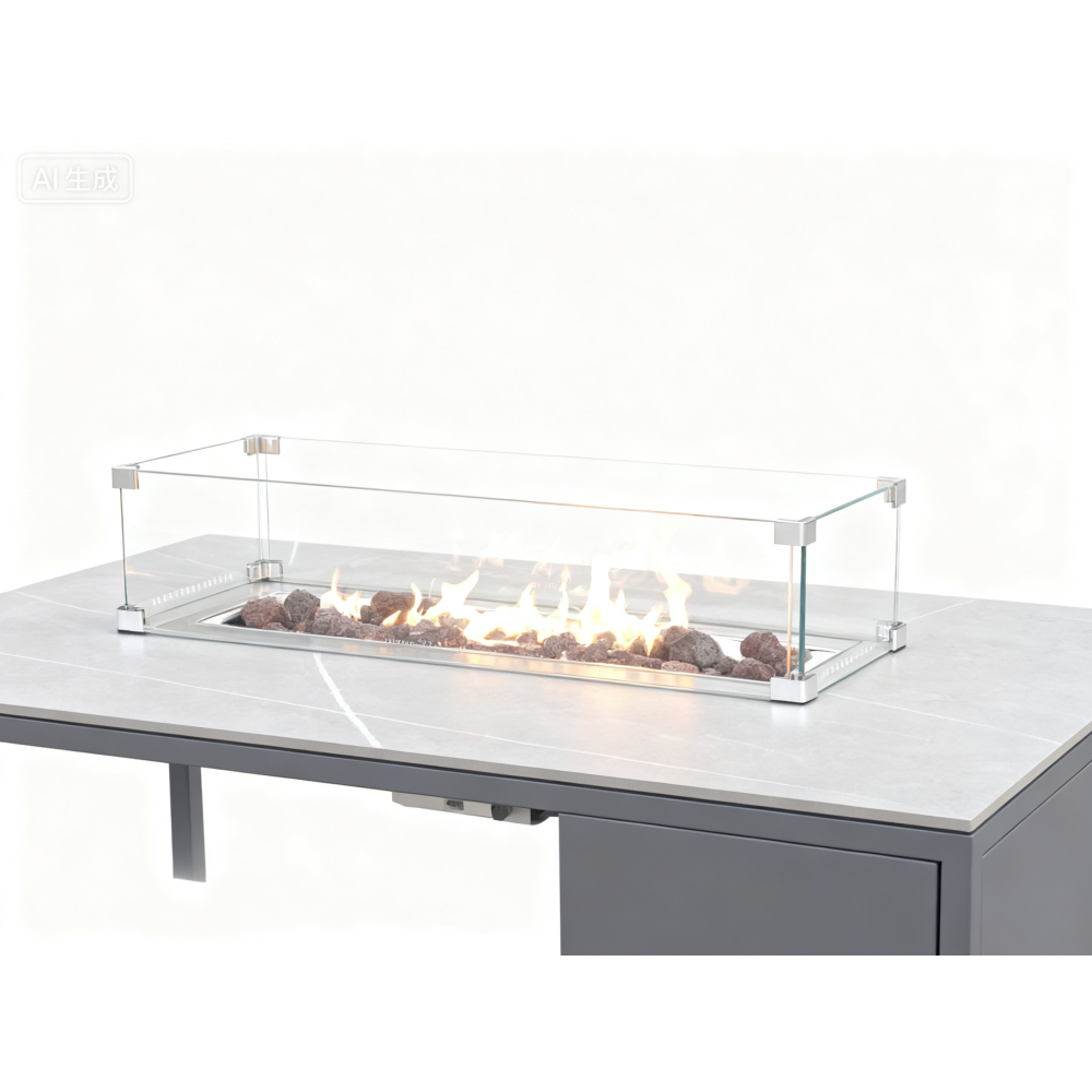Stoliki z wbudowanym kominkiem stają się centralnym elementem aranżacji — źródłem światła, komfortu i wizualnego charakteru przestrzeni. Fueggo wprowadza na taras przytulność oraz elegancką, nowoczesną estetykę.