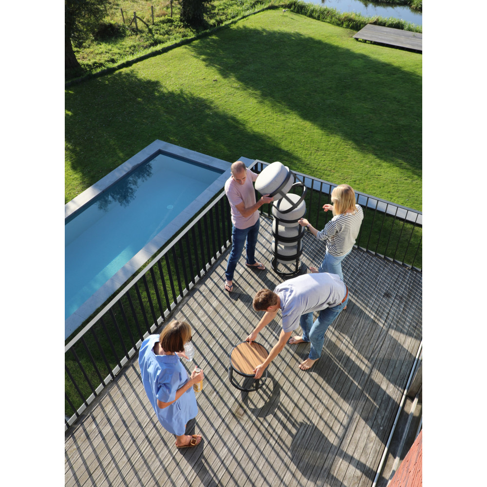 Модульний комплект для відпочинку на терасі або балконі. До складу комплекту входять: 2 пуфи та столик з поверхнею з тикового дерева та алюмінієвою рамою. Столик і пуфи можна складати один на один.