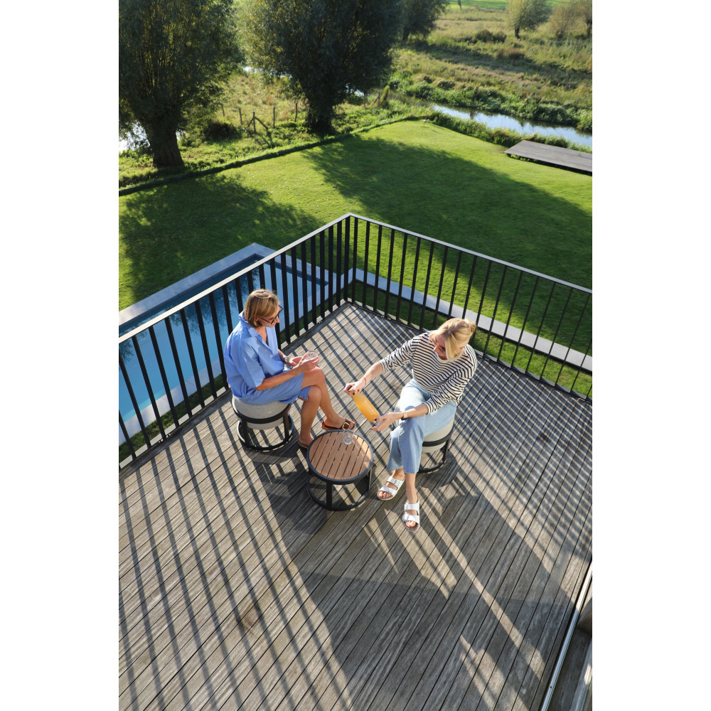 Модульний комплект для відпочинку на терасі або балконі. До складу комплекту входять: 2 пуфи та столик з поверхнею з тикового дерева та алюмінієвою рамою. Столик і пуфи можна складати один на один.