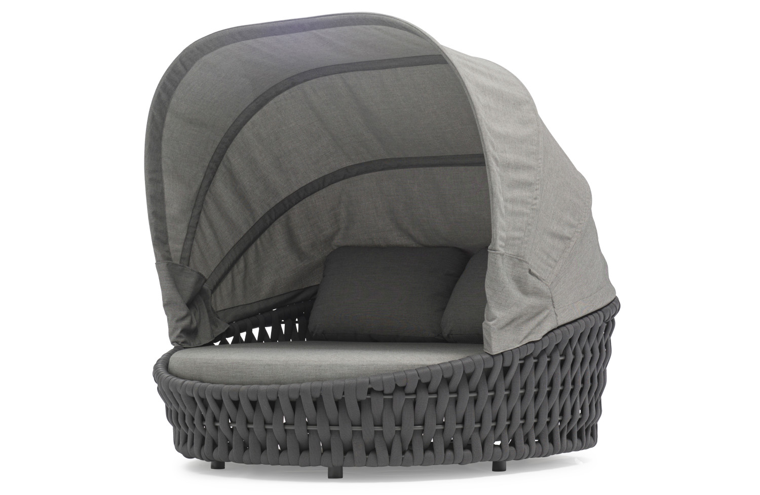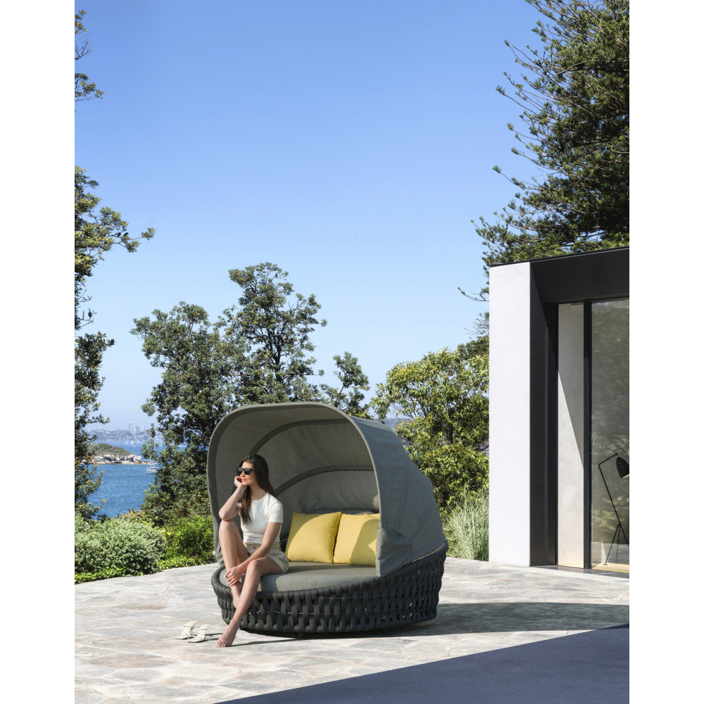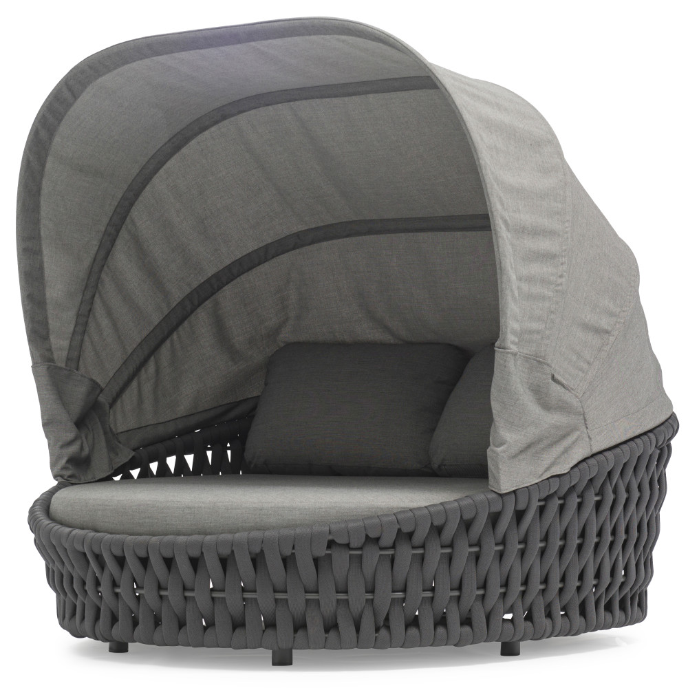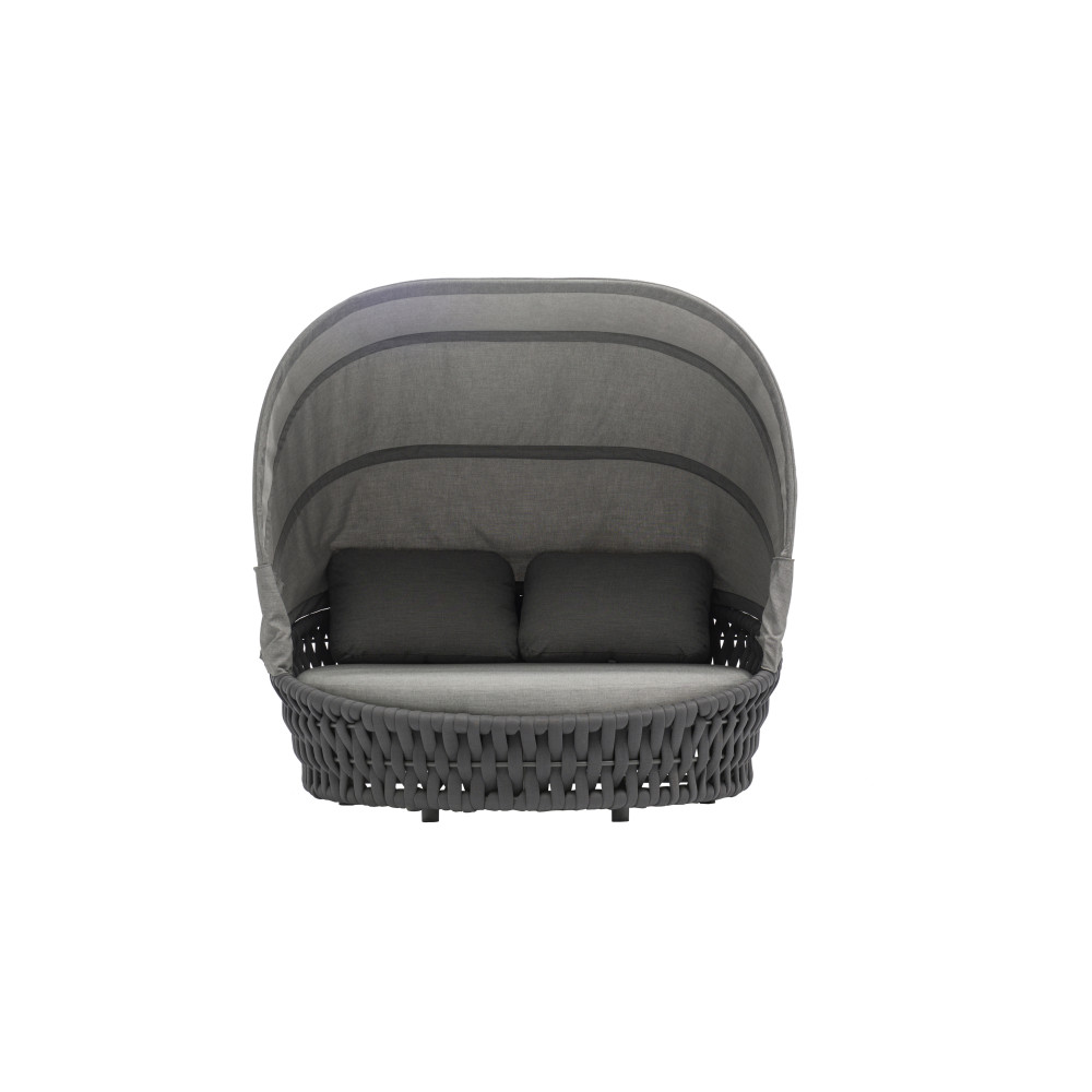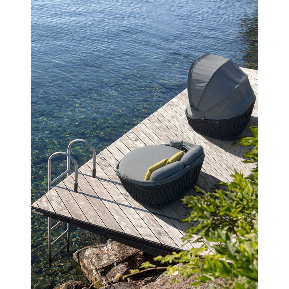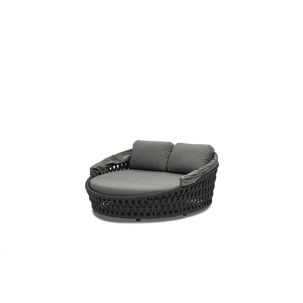 Ліжко Hug від преміального канадського бренду Couture Jardin. Каркас зварений з алюмінію, пофарбований у темно-сірий колір. Оформлений PVC плетінням відтінку антрацит. Для подушок використовується спеціальна тканина COUTUREtex, що відрізняється стійкістю до вологи та вицвітання на сонці. Наповнювач – пінополіуретан високої щільності.