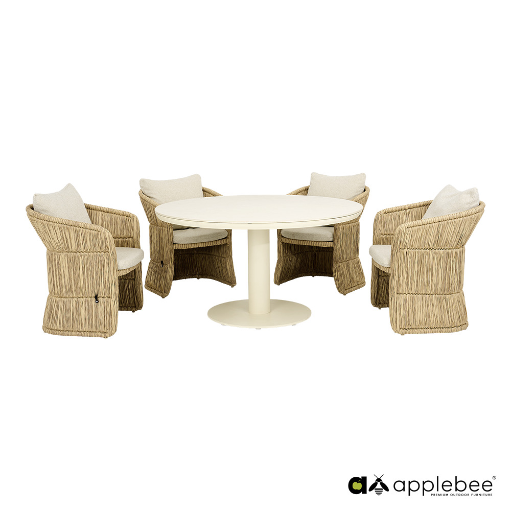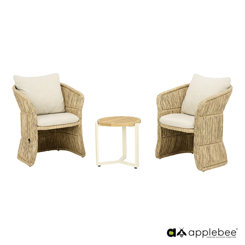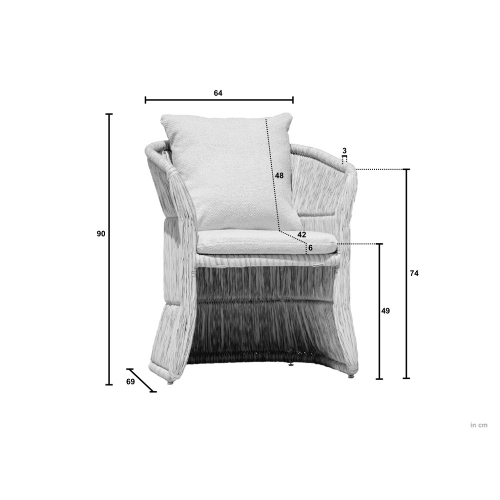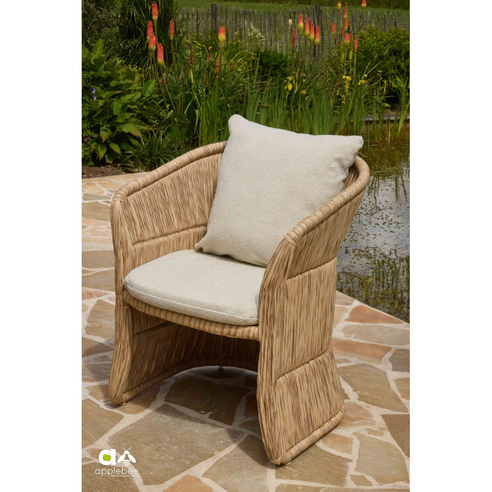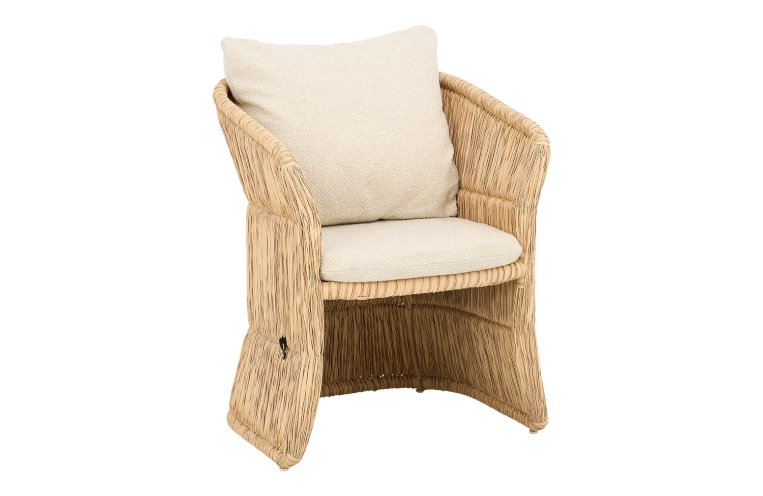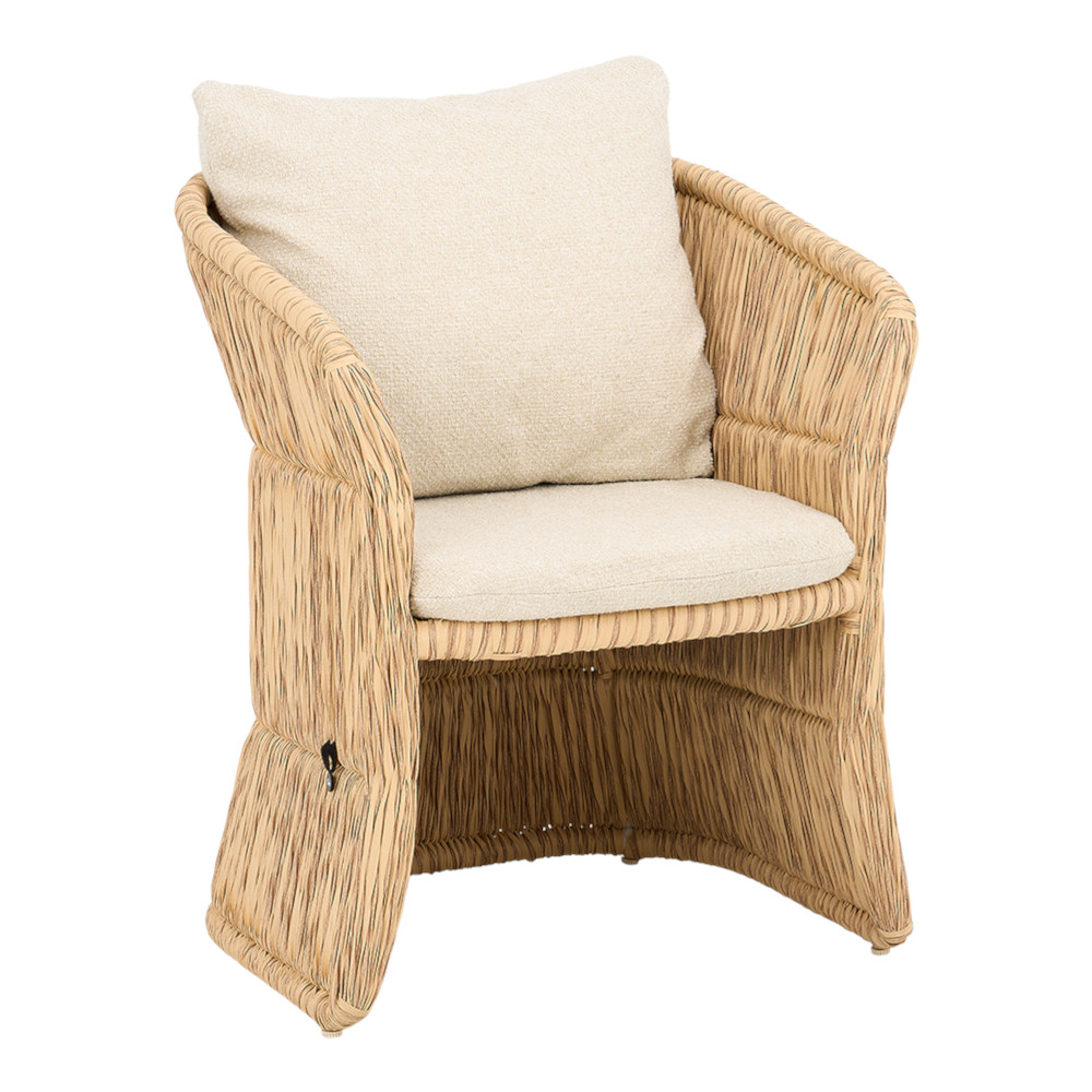 Завдяки плетінню Twisted Leaf стілець отримує виразний природний та трохи рустикальний вигляд, що формує розслаблену та затишну атмосферу. М’які подушки виконані з розкішної тканини Bouclé Cream та наповнені інноваційним матеріалом Bee Wett®, який забезпечує комфорт і стійкість до погодних умов.