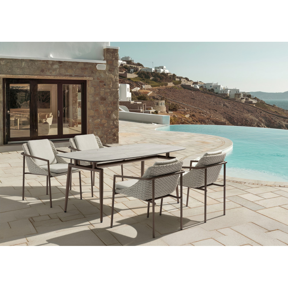 Погляньте на колекцію ENJOY — перші слова, що спадають на думку, це елегантність та витонченість. І хоч «кохання з першого погляду» звучить як кліше, у випадку з Couture Jardin — це реальність. Вишукана конструкція у темному бронзовому відтінку, майстерно сплетений каркас, зручні сидіння та спинки, обтягнуті якісною тканиною, стійкою до будь-яких погодних умов. Ця колекція ідеально поєднує комфорт і стиль, властиві продукції Kolibry Outdoor.