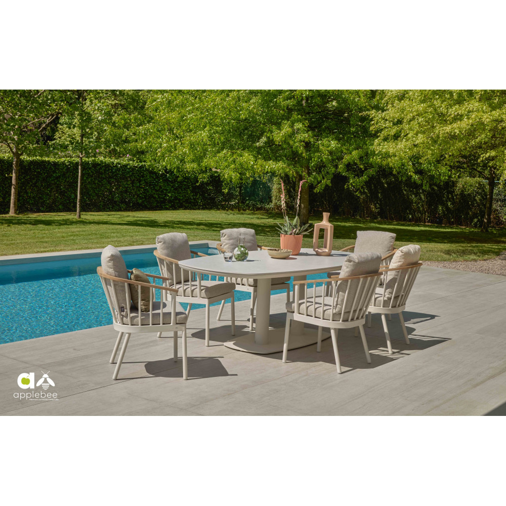 Стіл Melville від AppleBee — це сучасний та елегантний обідній стіл, який ідеально підходить для зовнішніх просторів. Стільниця виготовлена зі штучного каменю — матеріалу, відомого своєю міцністю та стійкістю до погодних умов.