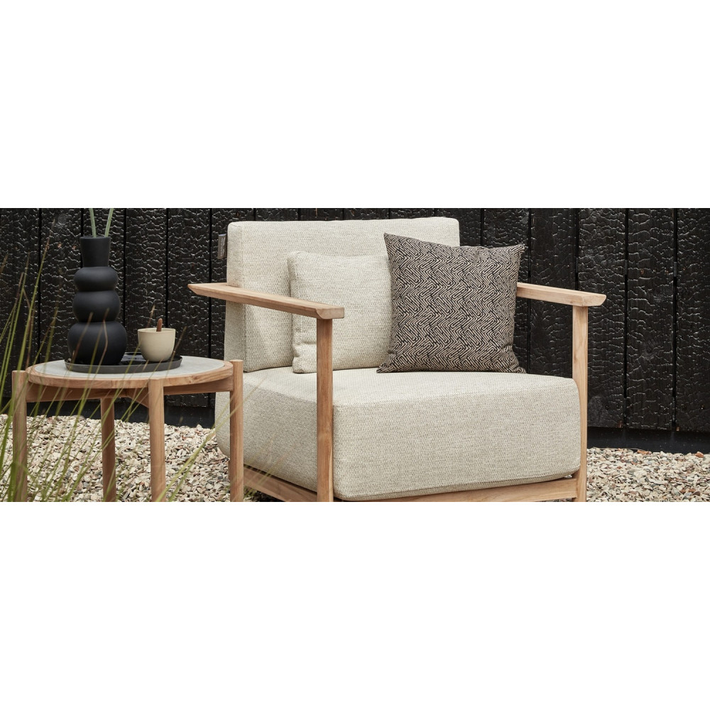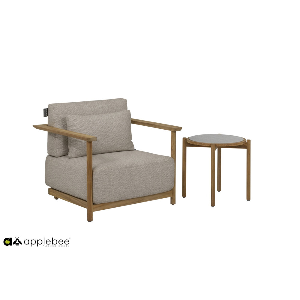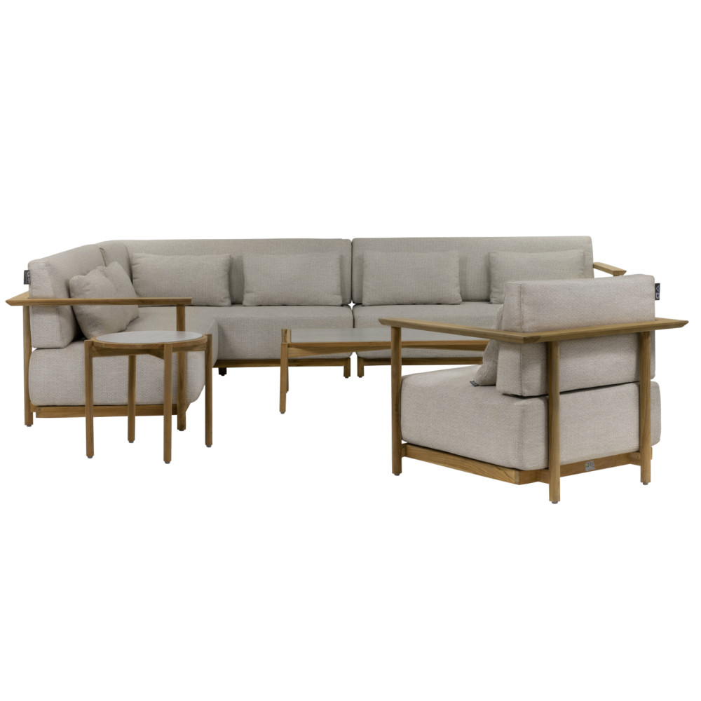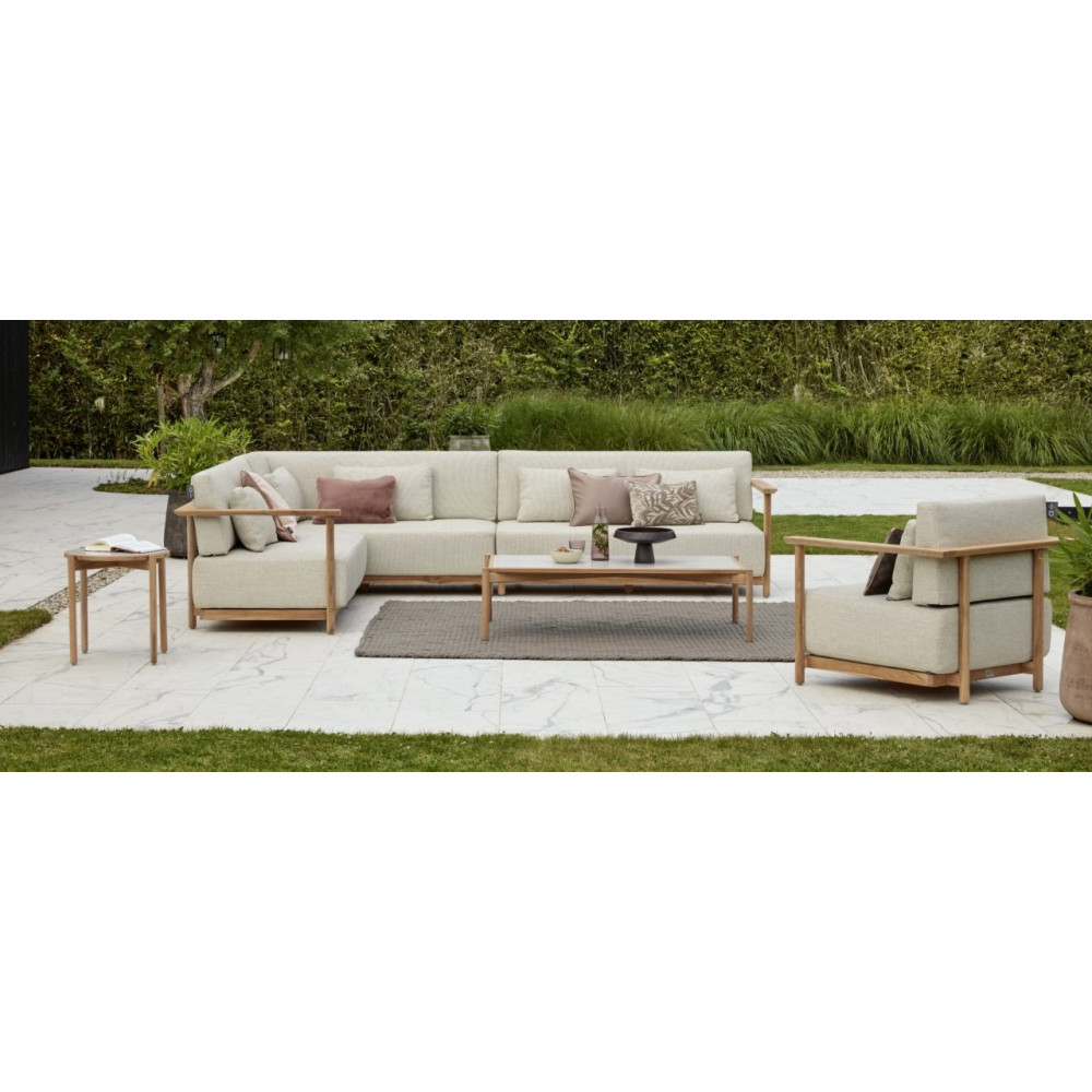 Є два різних столи, що поєднуються, прямокутний журнальний столик і круглий бічний столик. Обидва мають однаково красиву раму з тикового дерева та мають керамічну стільницю з травертиновим мотивом кремового кольору. Це ідеально поєднується з рештою колірної палітри. Зробіть один довгий диван з двох диванів або створіть простору кутову конструкцію з 3 або навіть 4 диванів. Хочете додати окреме крісло для відпочинку? Вибір за вами… Кого ви запросите на наступну вечірку в саду?