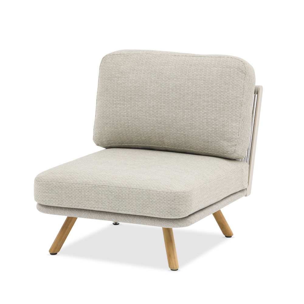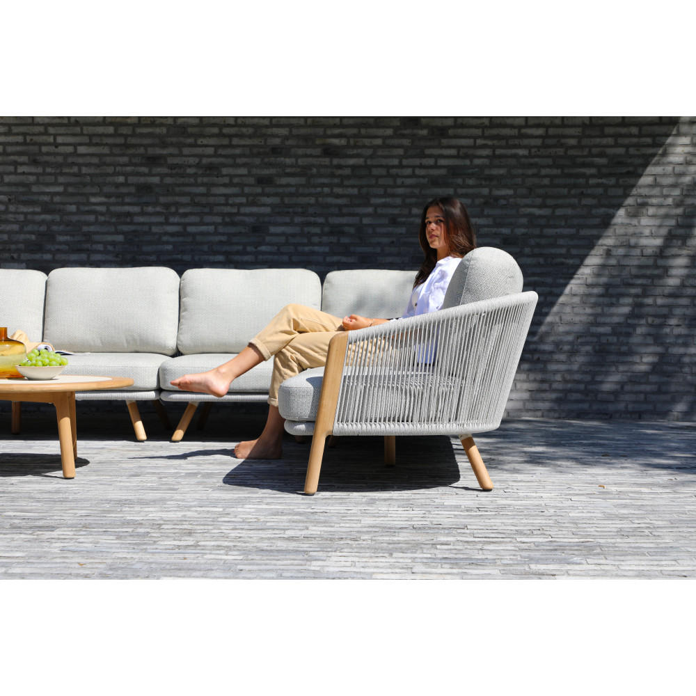 Кутовий комплект літніх меблів LAGOM у світлих відтінках тканини з використанням тика — це вишуканий комплект меблів, який поєднує в собі естетику та практичність. Він виготовлений із тикового дерева, що відоме своєю високою міцністю та стійкістю до зовнішніх впливів, таких як волога та зміни температури. Тик відзначається своєю природною витривалістю та чудовим зовнішнім виглядом, що робить його ідеальним матеріалом для використання у вуличній меблі.
