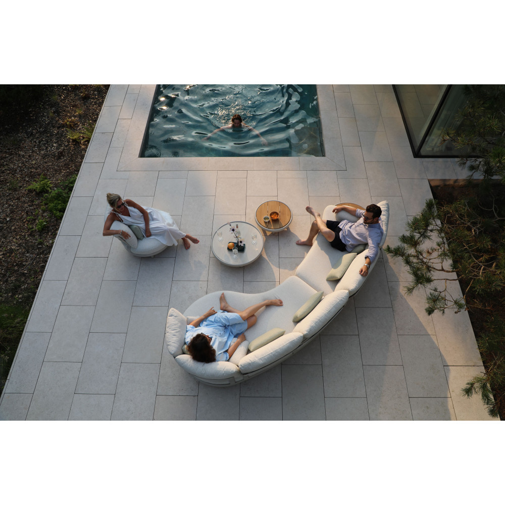 Компанія LAGOM створила щось особливе, абсолютно нове, образ вигнутий дивана LAGOM CLOUD надихає. Дивана LAGOM CLOUD з подушками, з кутов столом — унікальний усім своїм дизайнерським рішенням, своїми матеріалами найвищого класу і є функціональним доповненням вашого саду. LAGOM CLOUD є модульним комплектом і його можна укомплектувати на свій смак. Функціональний не тільки модульний диван, а й журнальний столик не поступається своєю універсальністю. Столик із стільницею з легкого бетону посередині укомплектований двома знімними тиковими підносами з боків. Дуже зручно для подачі їжі та напоїв!