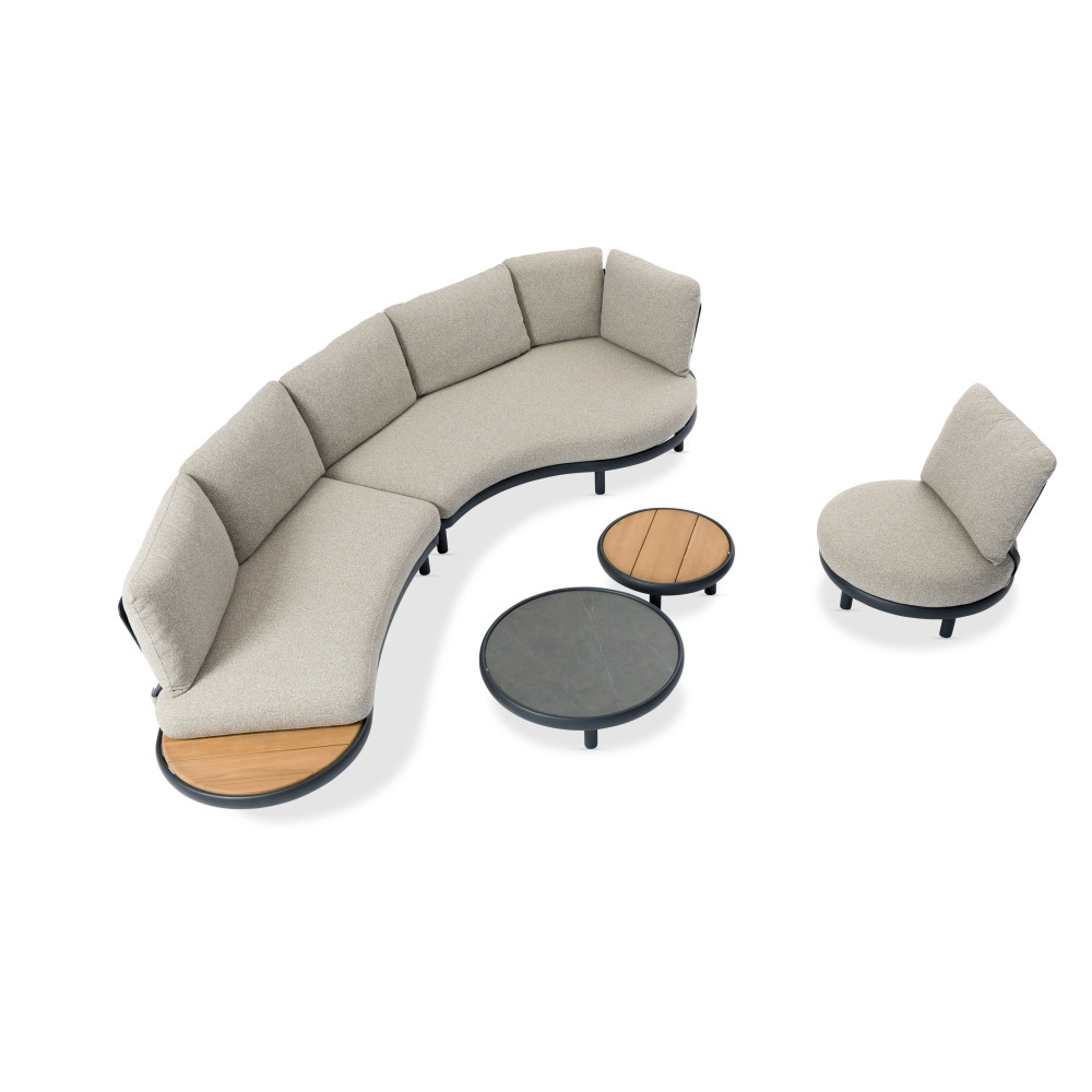 Компанія LAGOM створила щось особливе, абсолютно нове, образ вигнутий дивана LAGOM CLOUD надихає. Дивана LAGOM CLOUD з подушками, з кутов столом — унікальний усім своїм дизайнерським рішенням, своїми матеріалами найвищого класу і є функціональним доповненням вашого саду. LAGOM CLOUD є модульним комплектом і його можна укомплектувати на свій смак. Функціональний не тільки модульний диван, а й журнальний столик не поступається своєю універсальністю. Столик із стільницею з легкого бетону посередині укомплектований двома знімними тиковими підносами з боків. Дуже зручно для подачі їжі та напоїв!