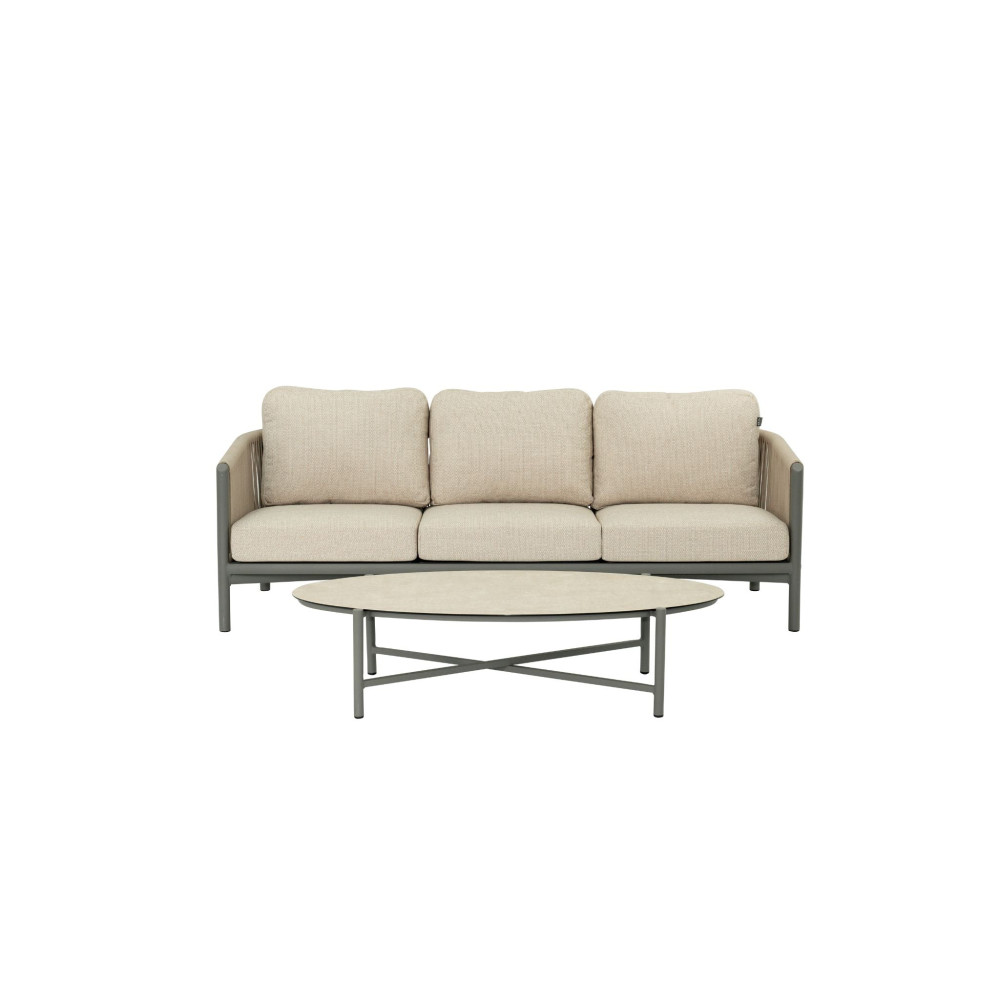 Каркас виконаний з алюмінію з порошковим покриттям у відтінках taupe або natural bronze. Матеріал стійкий до корозії, не боїться вологи та перепадів температур і підходить для цілорічного використання на відкритому повітрі. Спинки та бокові елементи оздоблені плетінням з rope — сучасного синтетичного канату з захистом від ультрафіолету. У dining- та lounge-столах використовуються стільниці з натурального тика, який з часом набуває благородної патини.