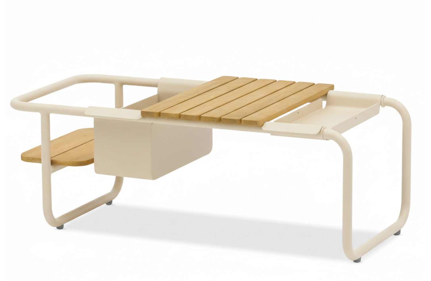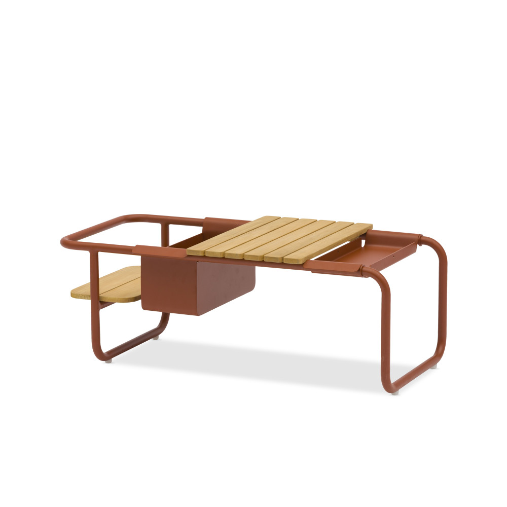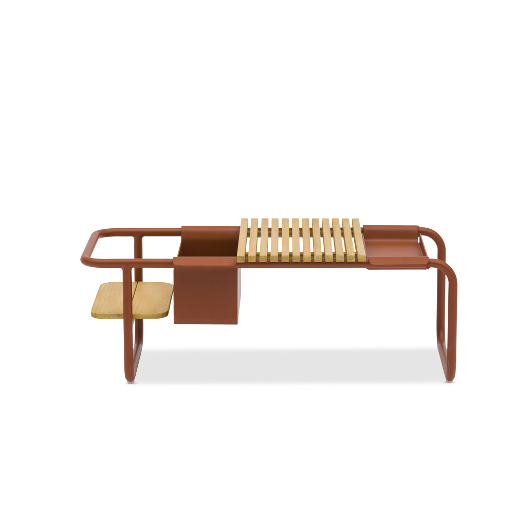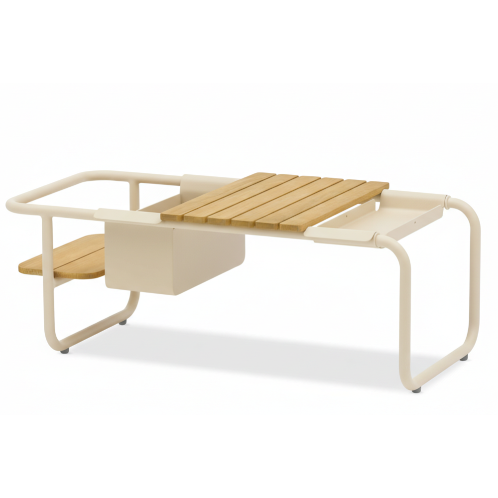Багатофункціональний кавовий столик з алюмінію та двоярусної тикової стільніці. У комплектації столика передбачено контейнер для льоду