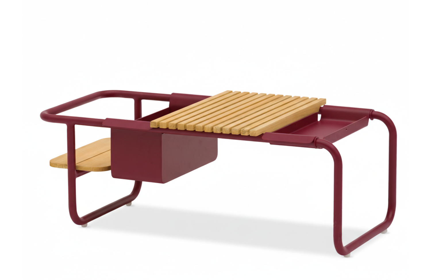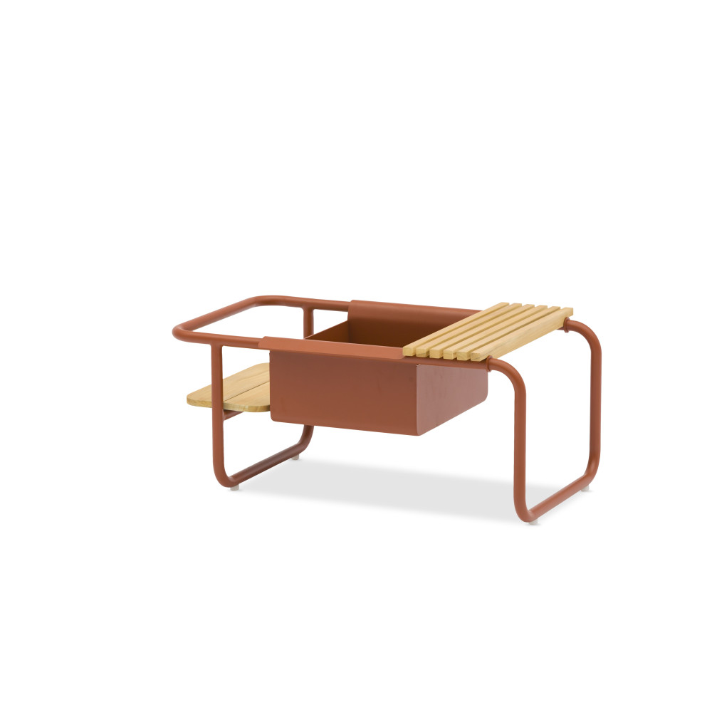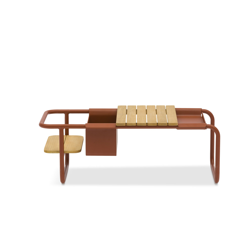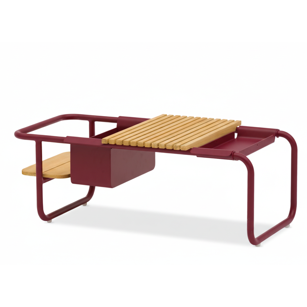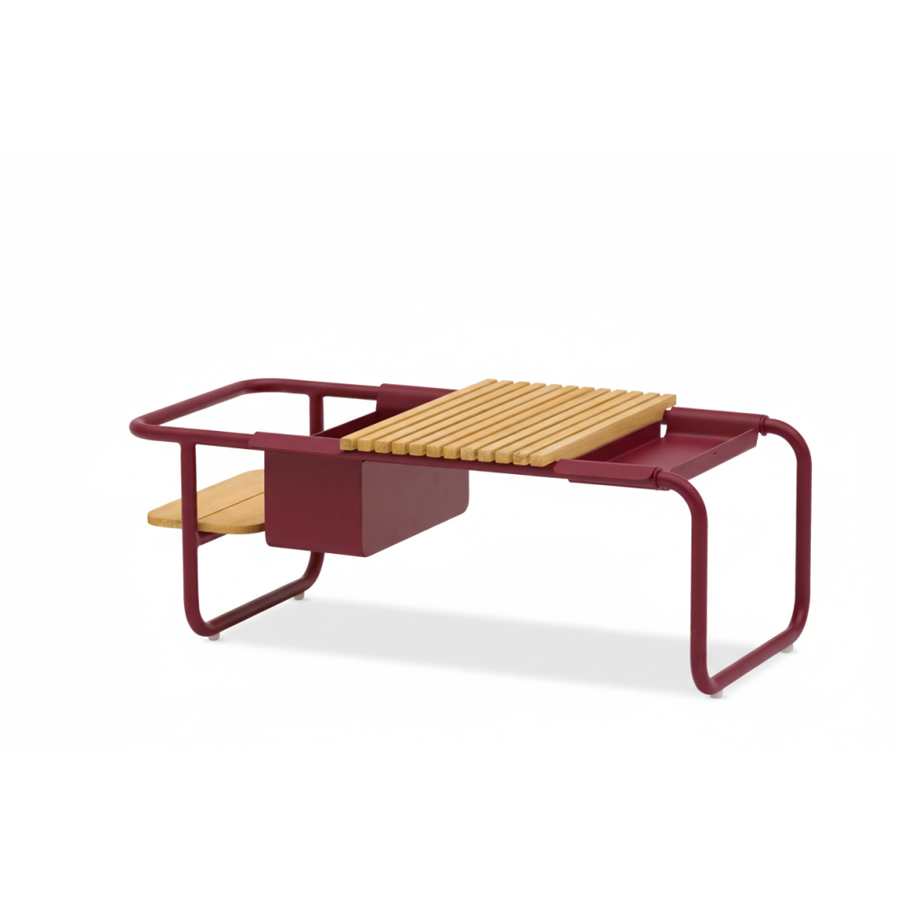 Багатофункціональний кавовий столик з алюмінію та двоярусної тикової стільніці. У комплектації столика передбачено контейнер для льоду