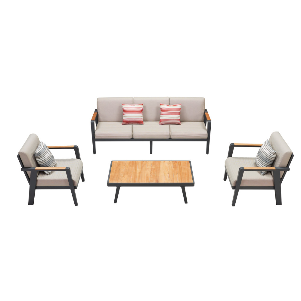 Higold — відомий виробник меблів, який славиться інноваційними рішеннями та високою якістю матеріалів. Комплект Emoti — одна з їх найкращих пропозицій, що поєднує алюмінієву раму для легкості та міцності, тикове дерево, яке забезпечує природну красу та стійкість до атмосферних впливів, а також поліестерові подушки, що забезпечують максимальний комфорт.