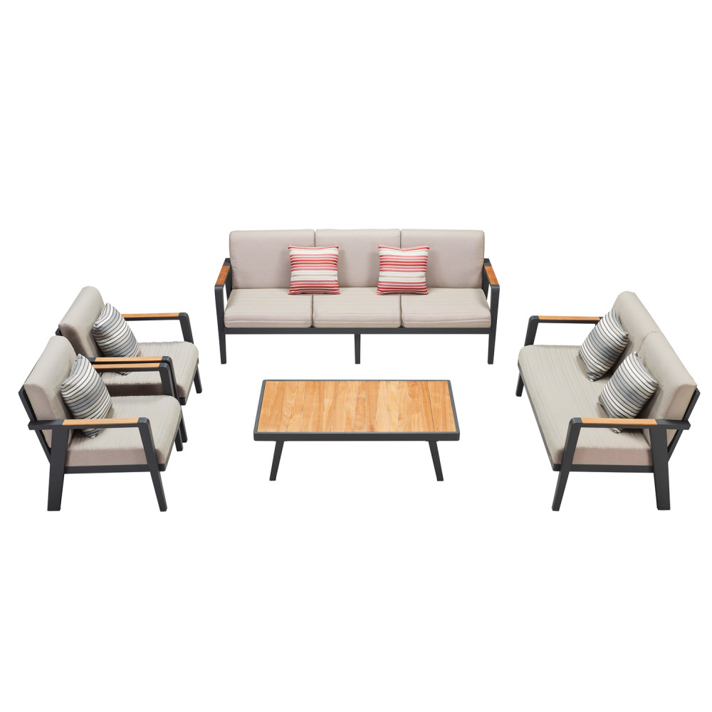 Higold — реномований виробник меблів, відомий інноваційними рішеннями та високоякісними матеріалами. Комплект Emoti є однією з їх унікальних пропозицій, що поєднує алюмінієву конструкцію для легкості та довговічності, тикове дерево з його природною привабливістю та стійкістю до погодних умов, а також поліестерові подушки, які гарантують комфортний відпочинок.
