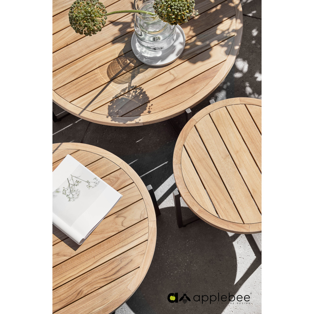 Стільниця з тику. Кожен листок унікальний і може трохи відрізнятися за структурою. Журнальний столик можна використовувати як у приміщенні, так і на вулиці, але особливо у поєднанні з іншою лінією серії Condor.