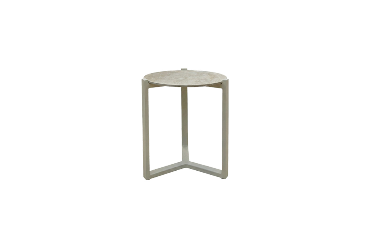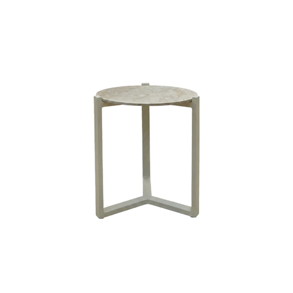 Основа виконана з алюмінію з порошковим покриттям у кольорах Black або Oyster. Каркас не піддається корозії та розрахований на цілорічне використання на відкритому повітрі. Контраст між теплою текстурою тика або світлою кам’яною поверхнею та мінімалістичною металевою основою надає столику сучасного, універсального характеру.