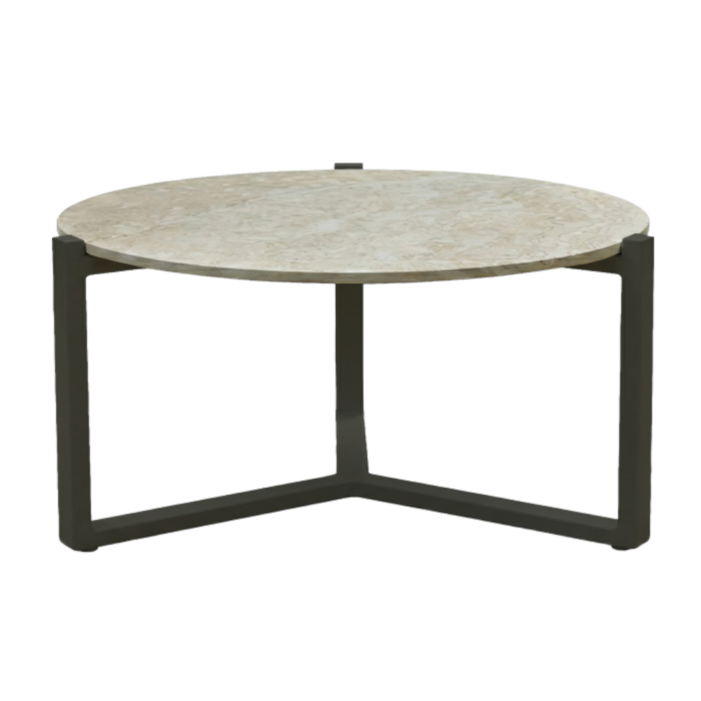 Основа виконана з алюмінію з порошковим покриттям у кольорах Black або Oyster. Каркас не піддається корозії та розрахований на цілорічне використання на відкритому повітрі. Контраст між теплою текстурою тика або світлою кам’яною поверхнею та мінімалістичною металевою основою надає столику сучасного, універсального характеру.
