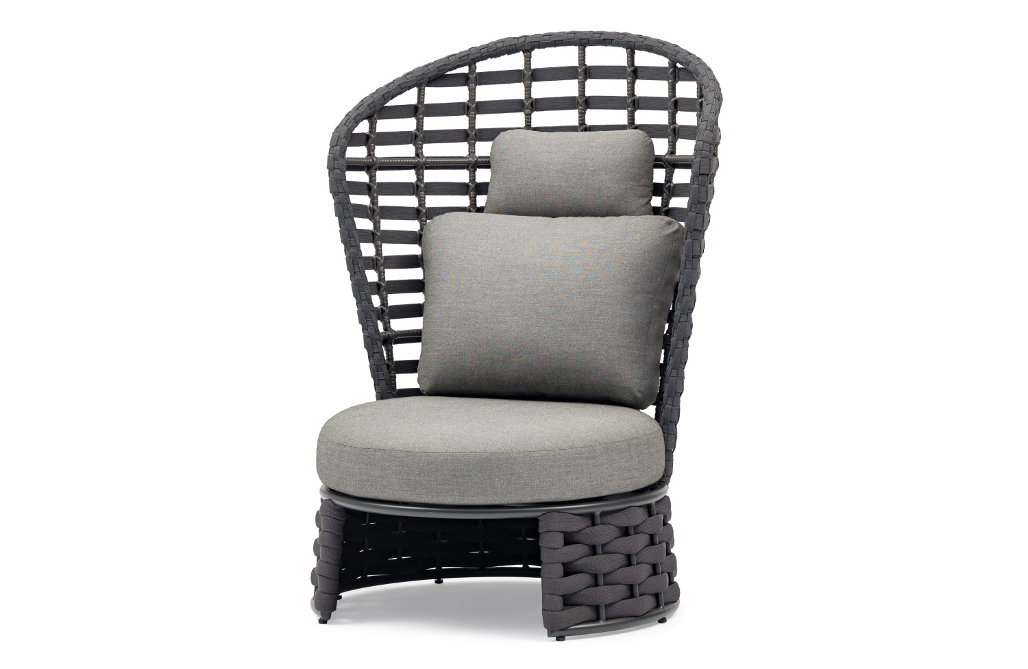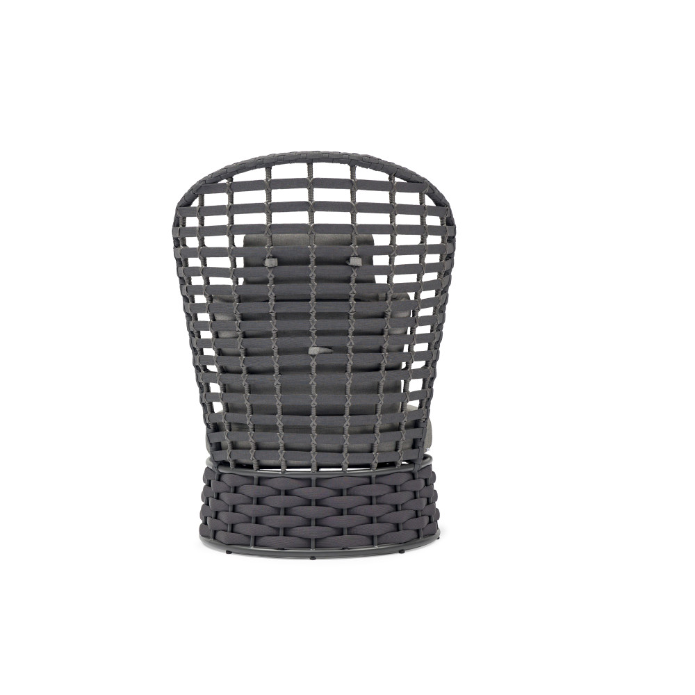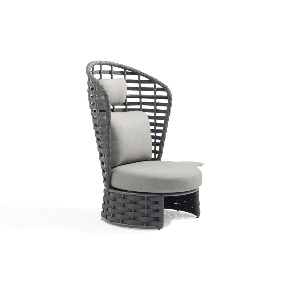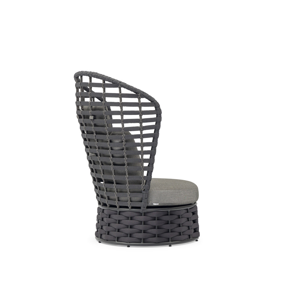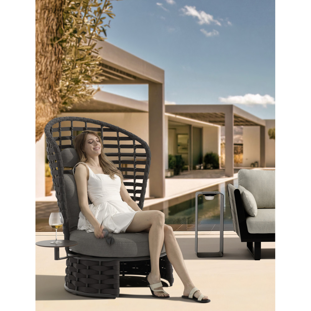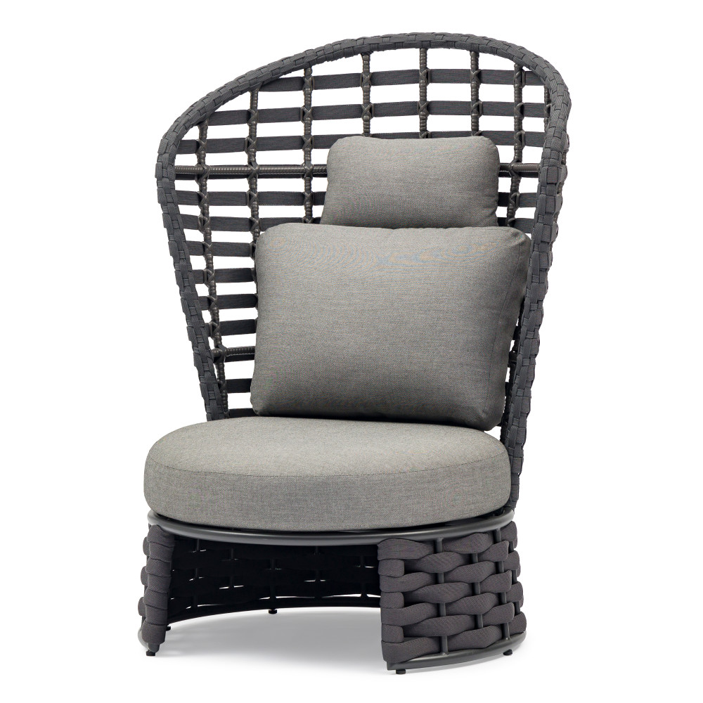 Крісло NOBLE від преміального канадського бренду Couture Jardin. Каркас зварений з алюмінію, пофарбований у темно-сірий колір. Оформлений PVC плетінням відтінку антрацит. Для подушок використовується спеціальна тканина COUTUREtex, що відрізняється стійкістю до вологи та вицвітання на сонці. Наповнювач – пінополіуретан високої щільності.