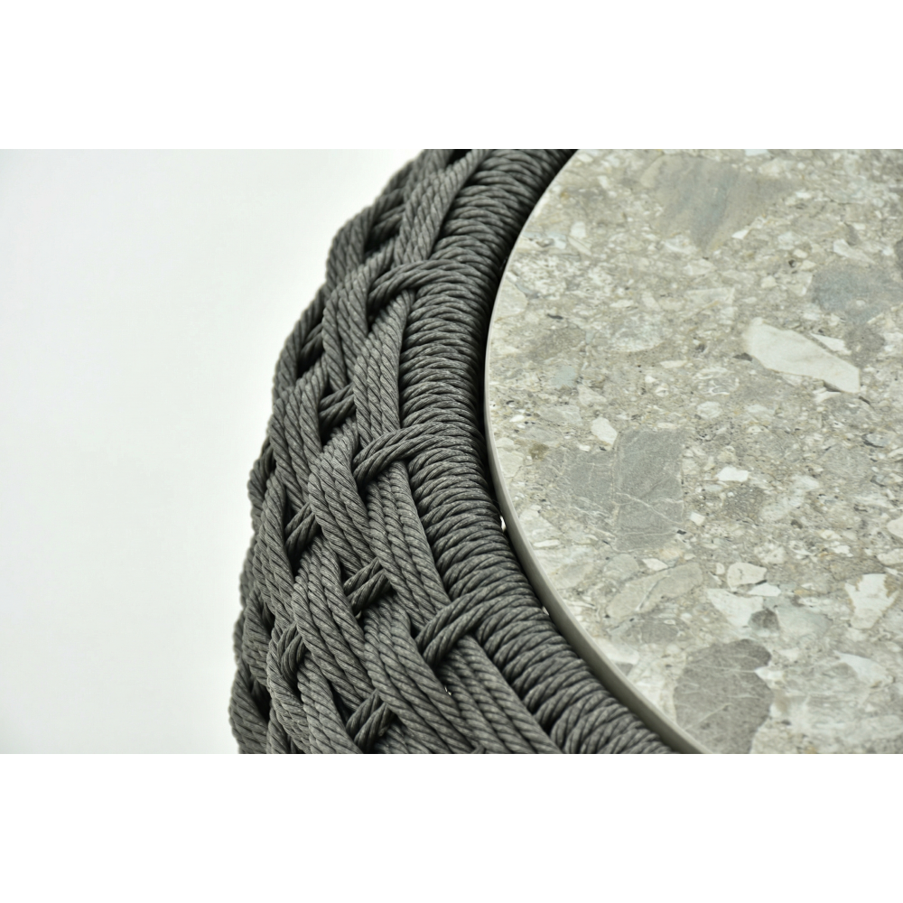 Міцна, але візуально легка конструкція виготовлена з алюмінію з порошковим покриттям, що гарантує стійкість до корозії та ультрафіолету. Об’ємна спинка з акрилового шнура додає текстури та створює зручну підтримку.