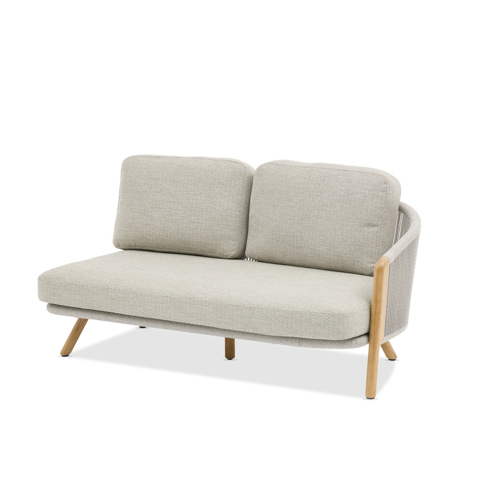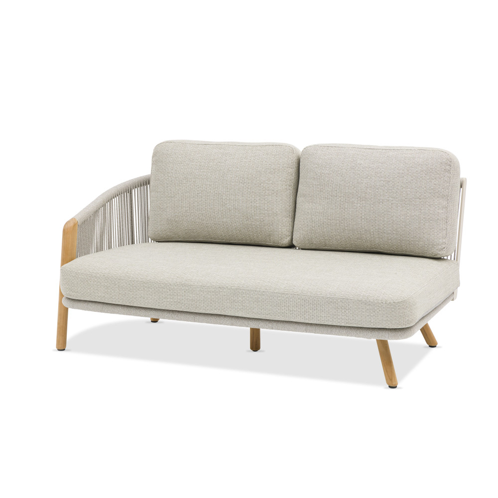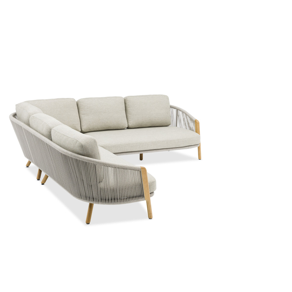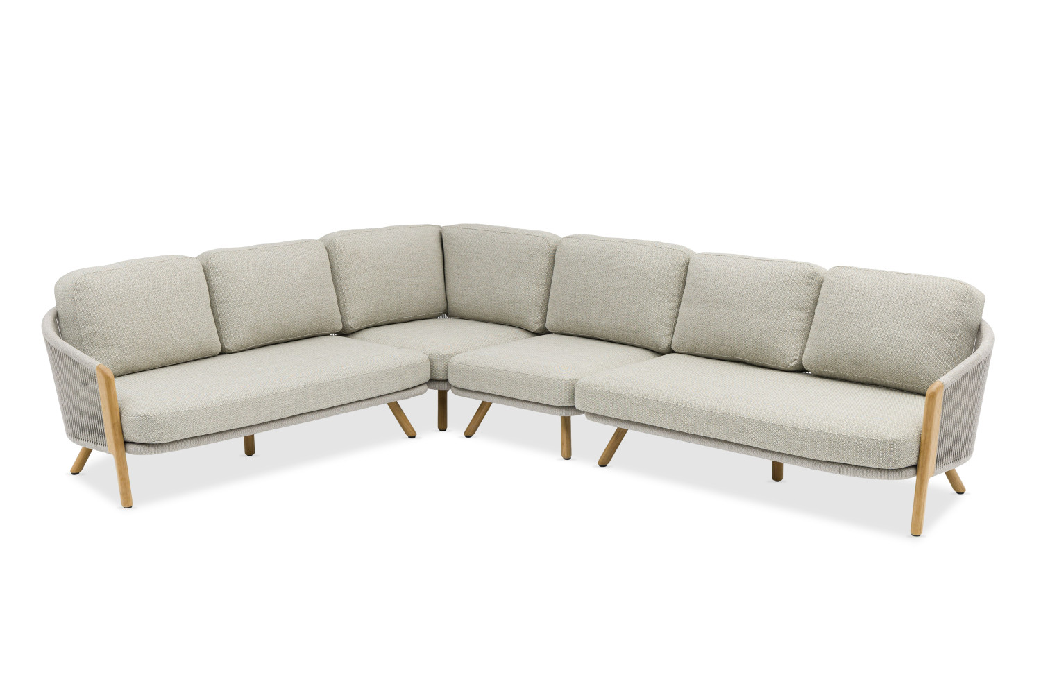 Кутовий комплект літніх меблів LAGOM у світлих відтінках тканини з використанням тика — це вишуканий комплект меблів, який поєднує в собі естетику та практичність. Він виготовлений із тикового дерева, що відоме своєю високою міцністю та стійкістю до зовнішніх впливів, таких як волога та зміни температури. Тик відзначається своєю природною витривалістю та чудовим зовнішнім виглядом, що робить його ідеальним матеріалом для використання у вуличній меблі.