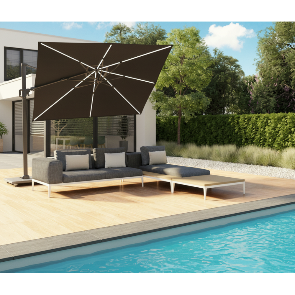 Забезпечує тінь протягом усього дня без переміщення завдяки нахилу T² назад і вбік та основі, що обертається на 360°