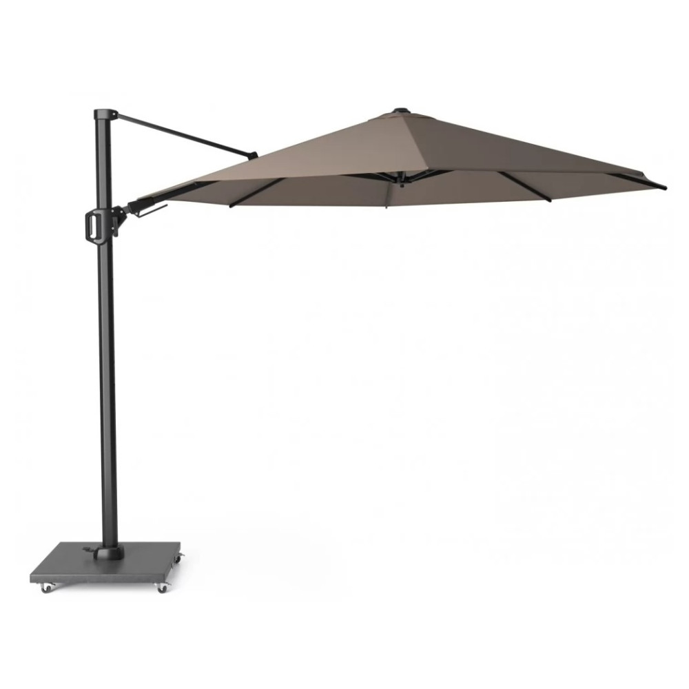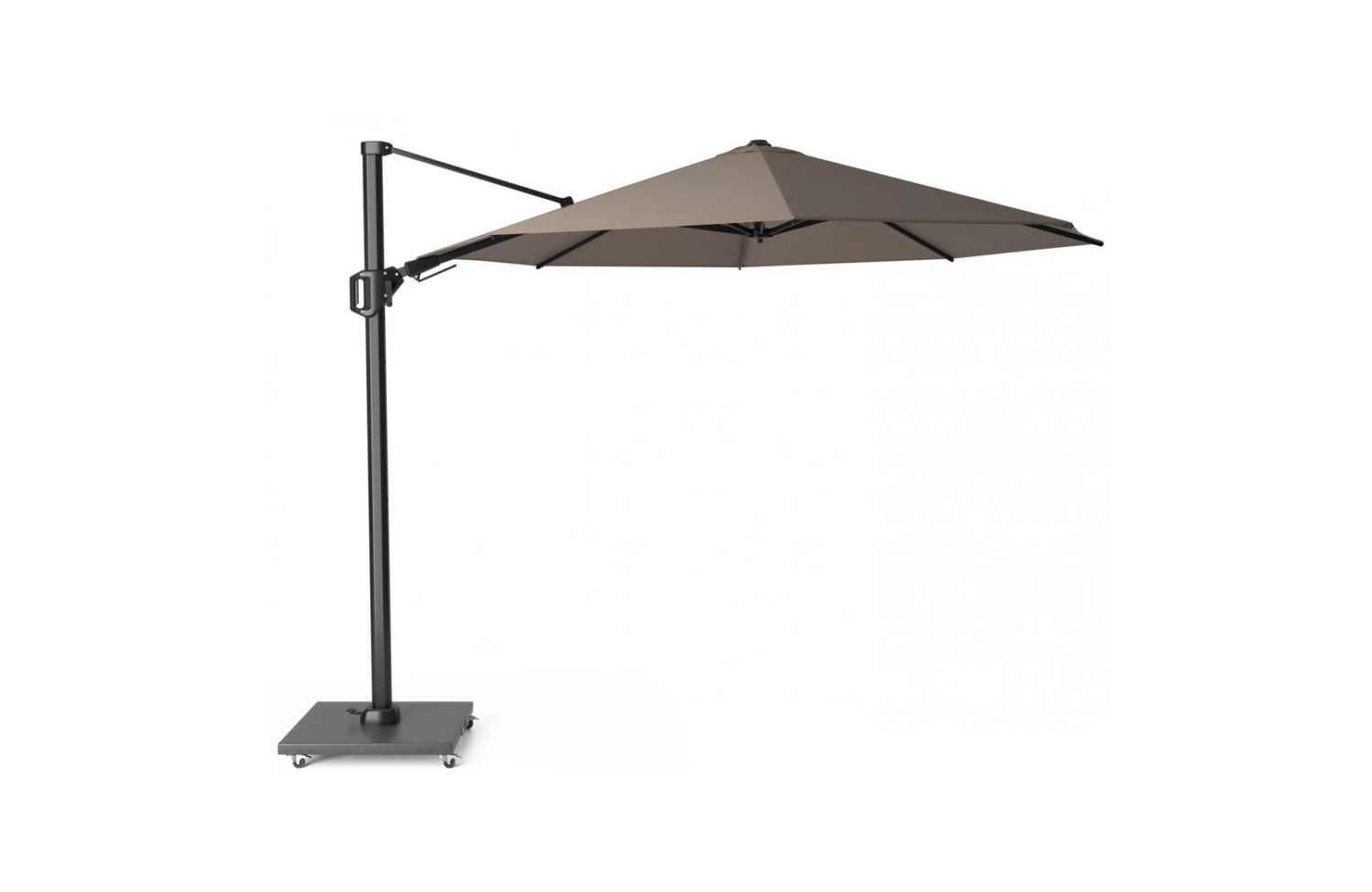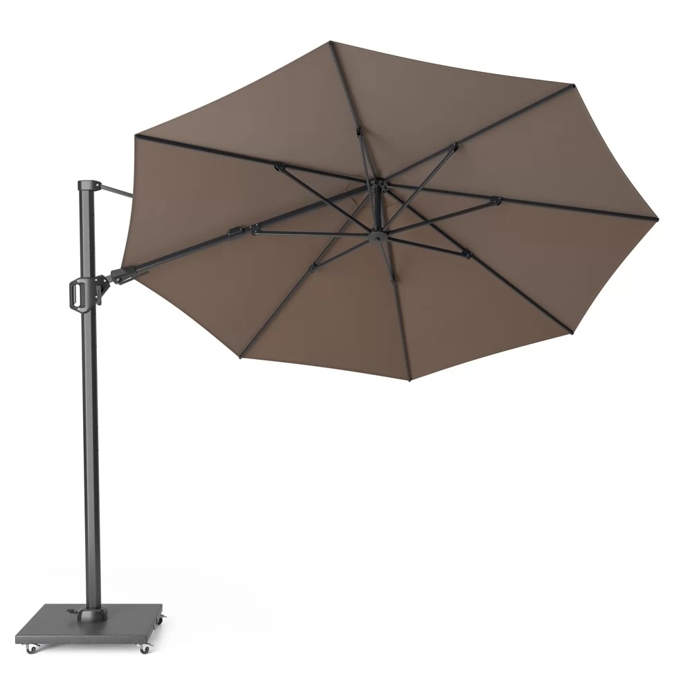 Внутрішні елементи механізму нахилу у двох площинах виготовлені з нержавіючої сталі, а ручка – з литого алюмінію. Перевагою консольної парасольки є те, що стійка розташована збоку, що дозволяє максимально ефективно використовувати простір під нею.