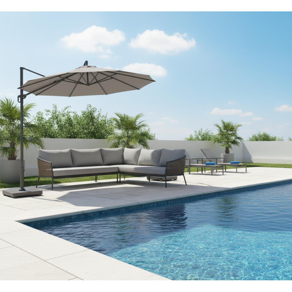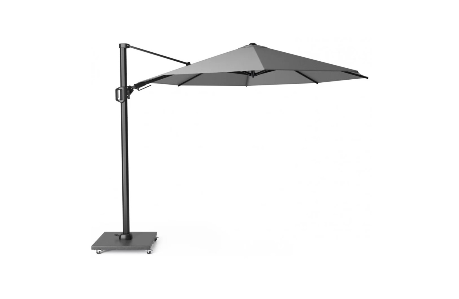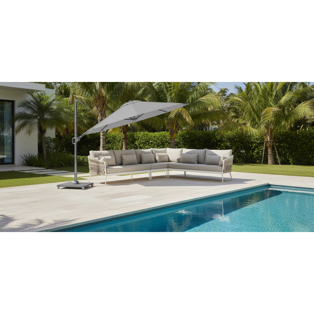 елементи механізму нахилу у двох площинах виготовлені з нержавіючої сталі, а ручка – з литого алюмінію. Перевагою консольної парасольки є те, що стійка розташована збоку. Тому парасольку можна розмістити трохи далі від садових меблів і використати весь простір під ним. Світлодіодне освітлення зробить Ваш вечір особливим і дозволить продовжити насолоду до пізньої ночі.